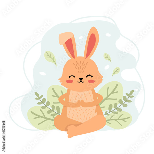 Rabbit doing yoga. Vector illustration of a meditating animal. Charming animal. Cute rabbit in cartoon style on the background of leaves. Creative illustration. T-shirt print. Isolated background.