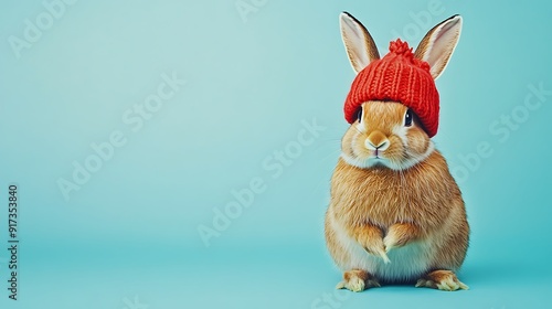 Rabbit wearing a knitted hat with copy space.