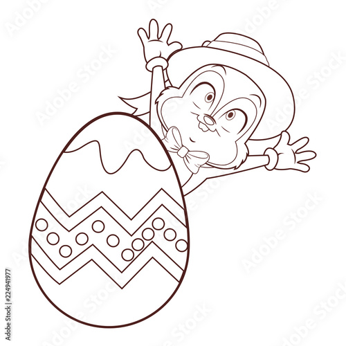 rabbit, easter, egg, cartoon, hat, bow, rabbit, vector, illustration, cute, happy, holiday, character, isolated, design, animal, funny, celebration, spring, season, art, greeting, decoration, nature, gift, traditional, fun, symbol, holding, clip, adorable, pet, drawing, mascot, icon, invitation, retro, brown, white, line