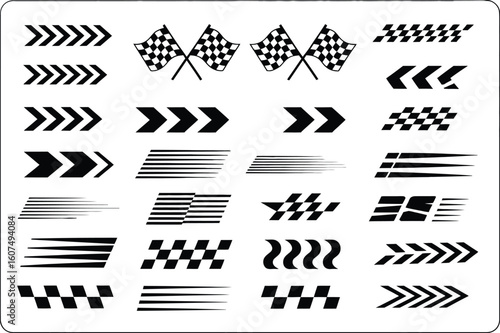 Racing car stripes set for motorsport visuals, including finish line effects, dynamic movement lines, and motocross racing label designs in bold styles
