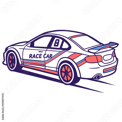 racecar, sports car, automobile, vehicle, speed, competition, race, track, performance, automotive, transportation, speedway, circuit, graphic, illustration, modern, dynamic, sleek, sporty, white, blue, red, purple