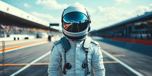 Racing Driver in Helmet at the Starting Line of a Racetrack