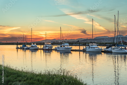 Racing sailing boats docked at Vancouver harbor. Marina With Docked Yachts during beautiful sunset