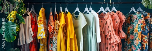 Rack of clothes hanging on a wall, featuring summer dresses and shirts. Creative concept of a womens clothing showroom or designer dresses store. Generative AI
