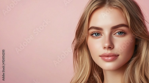 portrait, woman, european, american, pink, background, light, make-up, long, hair, clear, eye, natural, beauty, elegance, face, fashion, female, model, stylish, youthful, skin, healthy, glow, serene, calm, modern, attractive, delicate, complexion, fresh, trendy, bright, soft, pastel, feminine, minimalistic, copy, space, text, branding, professional, advertising, cosmetic, elegant, lifestyle