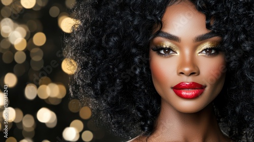 Radiant Beauty: A striking portrait of a beautiful woman with voluminous, dark curly hair, perfect makeup, and a captivating gaze, set against a backdrop of soft, golden bokeh lights.