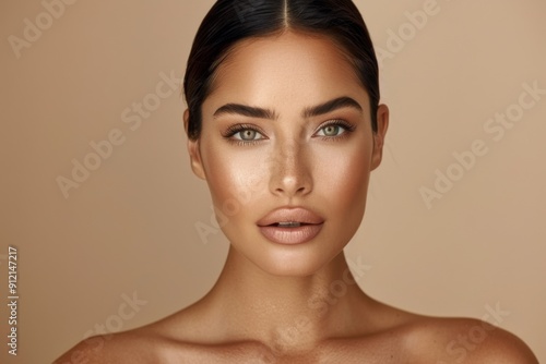 beauty, woman, make-up, elegant, aglow, skincare, portrait, model, fashion, glamour, cosmetic, perfection, foundation, reddening, highlighter, eyebrow, mascara, lip, neutral, luxury, skin, care, facial, attractive, youthful, healthy, glow, female, posing, studio, complexion, graceful, serene, serenity, wellness, symmetry, facial features, expression, closeup, brown eyes, dark hair, confidence, freshness, elegance, sensuality, professional, trendy