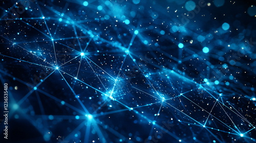 Radiant blue abstract network of interconnected nodes and glowing particles forming a digital cosmos, creating a sense of depth and technological innovation in the design.