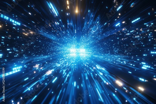 Radiant blue and gold lights converge, forming a dynamic tunnel effect, symbolizing speed, technology, and futuristic innovation