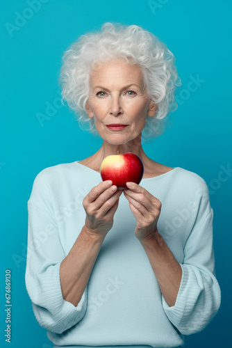 Radiant Elderly Lady Smiles, Holding an Apple Against a Blue Backdrop, AI generated