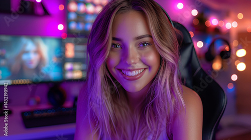 woman, girl, missy, female, streamer, gaming, technology, computer, desktop, setup, neon light, smiling, happy, confident, positive, energetic, beautiful, attractive, blonde hair, long hair, portrait, closeup, head shot, home, room, lifestyle, hobby, leisure, entertainment, digital, online, cyberspace, modern, contemporary, passion, fun, achiever, success, gamer, twitch