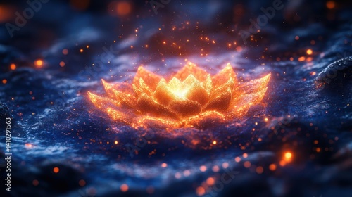 lotus, flower, gold, glowing, radiant, fire, energy, spiritual, peace, serenity, water, ocean, swirling, particle, fractal, abstract, vibrant, digital, art, three-dimensional, render, futuristic, aethereal, sacred, beauty, nature, light, bloom, design, texture, pattern, illuminated, mystical, calm, hope, zen, meditation, power, cosmos, universe, illumination, beautiful, modern