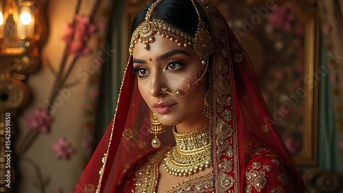 bride, indian, wedding, red, gold, jewellery, portrait, beautiful, woman, fashion, traditional, attire, culture, gorgeous, make-up, elegant, style, dress, saree, headpiece, veil, ornament, adornment, beauty, model, photo, studio, indoor, closeup, face, eye, hair, accessory, bridal, celebration, romance, love, marriage, ethnic