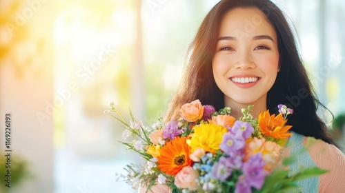 Radiant Joy: A beautiful woman with a warm, genuine smile holds a vibrant bouquet of flowers, radiating happiness and the beauty of nature.