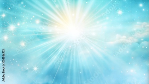 Radiant light rays bursting through soft blue clouds, creating a serene and uplifting atmosphere