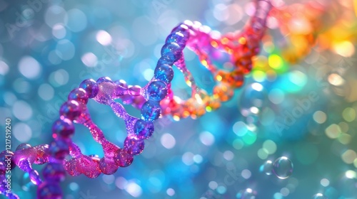 Radiant rainbow DNA double helix spiral surrounded by light bokeh and bubbles, creating a magical blue scene