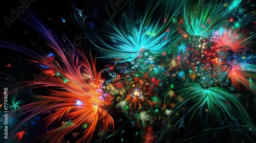 Radiant rays of red green and blue burst forth from bioluminescent organisms on a pitch black background.
