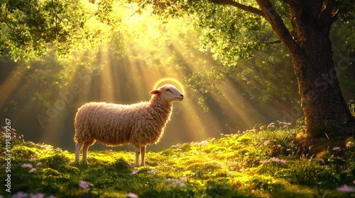 Radiant sheep in serene forest nature sunlit environment peaceful viewpoint spiritual concept