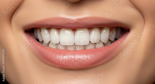 Radiant Smile: A close-up shot focuses on a perfect, bright smile showcasing healthy, white teeth and softly, pink lips. capturing a sense of well-being and joy.