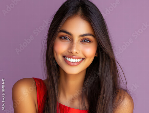 Radiant Smile: A young woman with long, dark hair and a bright, confident smile, wearing a red dress against a subtle purple background. Her radiant smile exudes happiness and self-assurance.