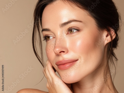 woman, beauty, skin, face, portrait, model, skincare, healthy, cosmetic, make-up, beautiful, young, female, natural, glow, clean, fresh, attractive, wellness, person, elegance, glamour, cosmetology, aesthetic, dermatology, spa, treatment, rejuvenation, youth, hydratation, moisturise, flawless, complexion, closeup, studio, background, brown hair, hazel eyes, hand, serene, calm, confident, well-being, lifestyle, health, beauty product, advertising