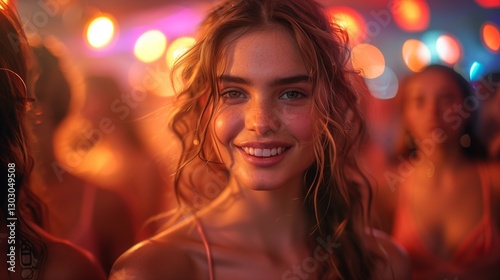 woman, wavy hair, blonde hair, freckle, smile, nightlife, crowd, lively, radiant, event, bright, portrait, elegant, joyful, vibrant, festive, night, warm, alluring, dynamic, cheerful, energetic, beautiful, soft focus, glamourous, social, enchanting, sparkling, confident, picturesque, charming, inviting, captivating, happy, dazzling, trendy, breathtaking, exciting, harmonious, stunning
