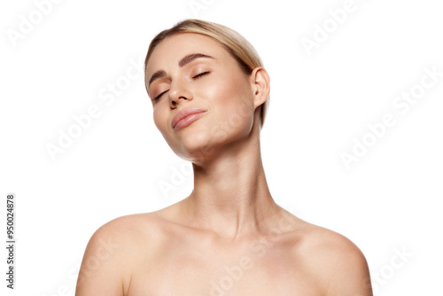 Radiant young woman with clear, perfect skin embodies the ideal of natural beauty, isolated on white studio background. Concept of beauty, plastic surgery, face lifting, face building
