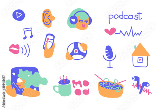 antennae, audio, background, web log, broadcast, broadcaster, cartoon, character, colours, communication, concept, design, device, doodle, drawing, equipment, flat, fm, graphic, host, hosting, icon, illustration, interview, media, mic, microphone, modern, music, podcast, radio, record, signs, sound, speaker, speech, station, streaming, studio, symbol, technology, text, vector, voice, wave, woman, word, workspace