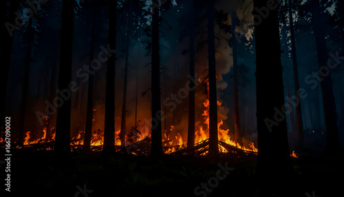 Raging fire in dense forest, state of emergency, ecological disaster