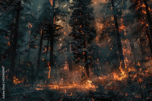 Raging wildfire consuming forest landscape, burning trees with intense orange flames