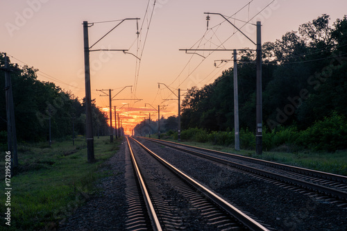 Railroad tracks stretching into the distance on a summer evening