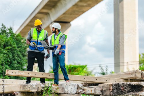 Railway engineer and technician inspecting concrete pier sections and construction debris