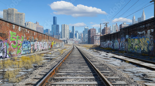 Railway track cutting through an urban area, surrounded by tall buildings, graffiti-covered walls, and overhead power lines --chaos