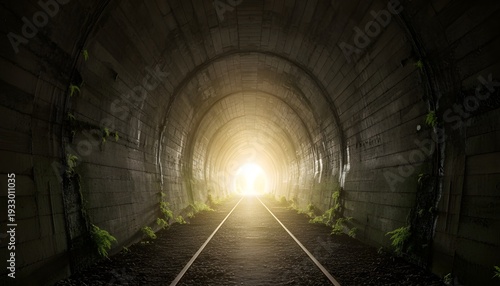 Railway Tracks Leading to Bright Light at the End of Dark Stone Tunnel, Green Moss and Ferns on Walls, Abandoned Train Passage, Conceptual Journey into the Unknown, Mystery and Hope