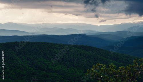 Rain over forest mountains. Misty mountain landscape hills at rainy day.