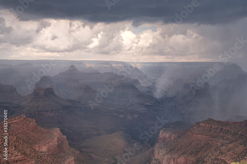 Rain storm over the expanse of the Grand Canyon with dramatic clouds dripping rain