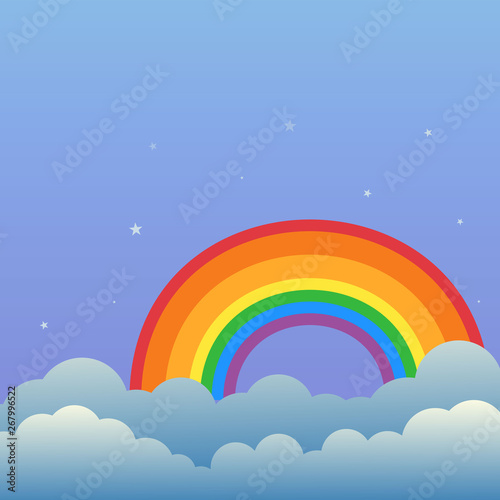Rainbow in the night sky with clouds and stars cartoon vector illustration.Nature colorful rainbow on clouds