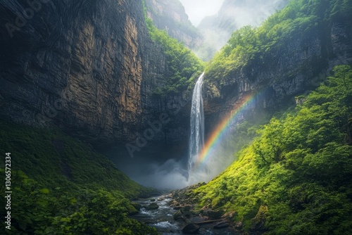 rainbow, misty, waterfall, lush, greener, cascading, rocky, cliff, nature, landscape, scenery, serene, tranquil, aethereal, colourful, beauty, natural, rainbow colours, water, flow, mist, rock, tree, plant, vibrant, majestic, picturesque, peaceful, outdoors, environment
