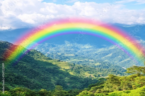 Rainbow over mountains landscape, vibrant and colorful scenery