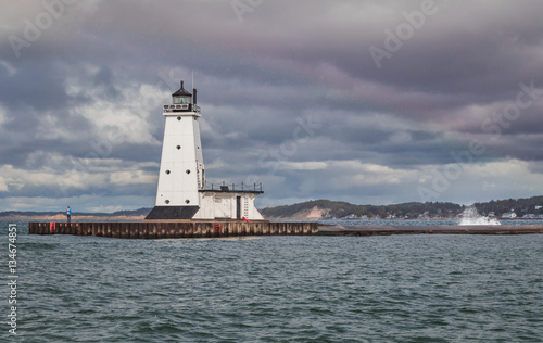 rainbow, lighthouse, cloud, lake michigan, pier, splash, wave