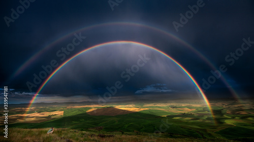 panorama, cloud, cloudy, crop, double, farmland, field, hill, man, ominous, palouse, photographer, rain, rainbow, rolling, rural, shadow, storm, sunlight, washington