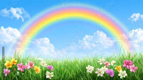 rainbow, sky, field, vibrant, arching, grassy, blooming, flower, hope, new, field, illustration