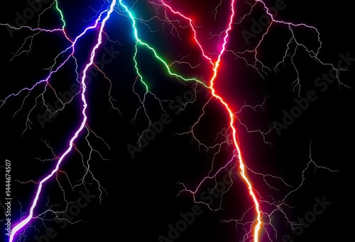 Rainbow-hued lightning bolts and electric arcs crackle across a black background, showcasing raw energy and power, bolt, physics