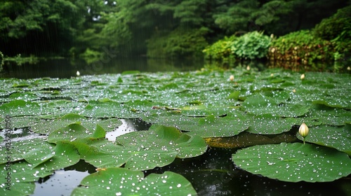 Rain-covered lotus pond, lush greenery background, serene nature scene, ideal for relaxation themes