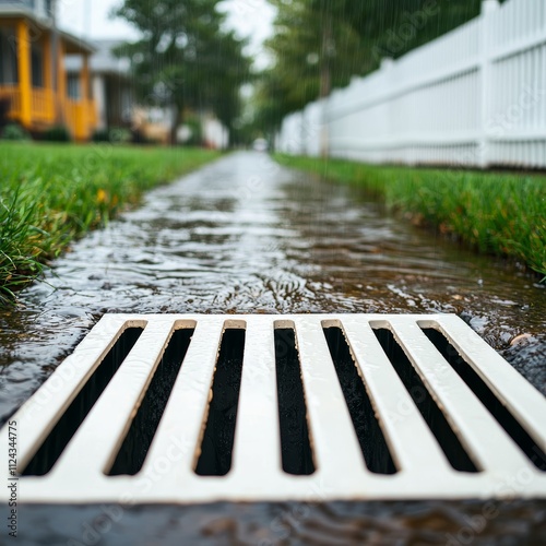 Rainwater drainage system residential street photography urban environment ground level infrastructure and nature's interplay