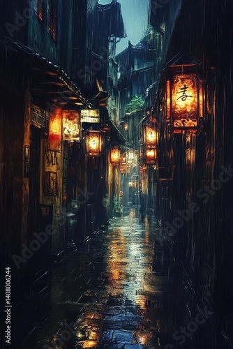 Rainy alleyway with glowing lanterns in a mystical cityscape at night in vibrant artistic style