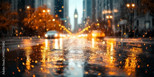 Rainy City Street with Glowing Reflections from Cars and Street Lamps