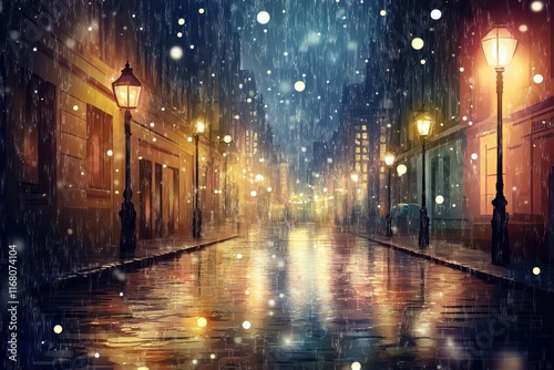 rain, night, city, street, light, building, wet, reflections, dark, glow, urban, atmosphere, ambience, moody, romantic, cosy, calm, peaceful, serene, quiet, solitude, mystery, magic, enchanting, dreamy, nostalgic, vintage, old, classic, architecture, window, pavement, sidewalk, water, puddle, bokeh, soft, blurry, artistic, illustration, painting