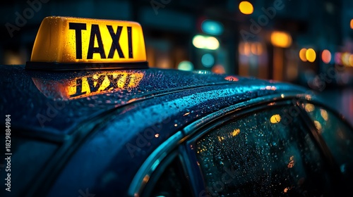 Rainy Night Taxi Cab Detail Yellow Sign, Wet Roof, City Lights Bokeh