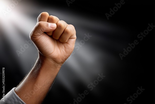 Raised fist of a determined individual, symbolizing strength and empowerment, illuminated by soft light against a dark background, conveying a powerful message of resilience and unity